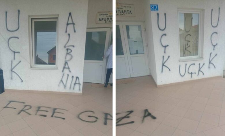 Особа албанске националости, за коју очевици тврде да је била у пијаном стању, данас поподне, исписала је графите: „УЧК“, „Албанина“, „Слобода Палестини“, „Слобода Гази“, на објекту амбуланте и дечијег вртића у селу Добротин код Липљана.