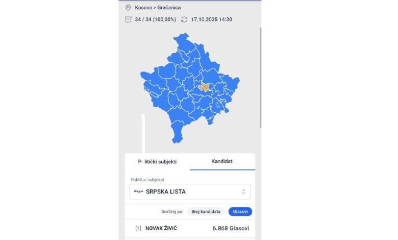 У Грачаници је Српска листа добила 63.98 одсто гласова за будући састав скупштине, Албански савез 22.95, “За слободу, правду и опстанак” 10.08, Српски Народни Покрет 2.01 а “Косовски савез” 0.98 одсто.